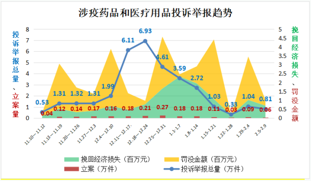 “二十條”和“新十條”出臺(tái)后,疫情防控重心從防控感染轉(zhuǎn)到醫(yī)療救治,2022年11月10日至2022年底,全國(guó)12315平臺(tái)接收相關(guān)投訴舉報(bào)24.11萬(wàn)件,同比增長(zhǎng)3.88倍,環(huán)比增長(zhǎng)2.95倍,最高峰值達(dá)到19.5倍。其中,投訴14.18萬(wàn)件,舉報(bào)9.93萬(wàn)件,挽回經(jīng)濟(jì)損失498.17萬(wàn)元。