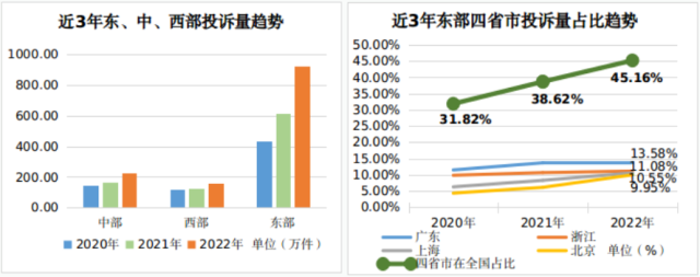 從近三年趨勢(shì)看,廣東、浙江、上海、北京4個(gè)省市的消費(fèi)正在加速集聚。消費(fèi)投訴數(shù)量與消費(fèi)活躍水平呈正相關(guān)關(guān)系,四省市消費(fèi)投訴數(shù)量在全國(guó)的占比從2020年的31.8%增長(zhǎng)到2022年的45.16%。