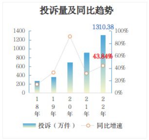 2022年,全國(guó)市場(chǎng)監(jiān)管部門受理消費(fèi)者投訴1310.38萬(wàn)件,同比增長(zhǎng)43.84%,增速較2021年有所放大。其中,售后服務(wù)問(wèn)題增長(zhǎng)最快,群眾反映最強(qiáng)烈,同比增長(zhǎng)57.67%。消費(fèi)者訴求主要集中在不退款、不發(fā)貨、不履行“三包”承諾、不落實(shí)七天無(wú)理由退貨義務(wù)、送貨不及時(shí)等方面。