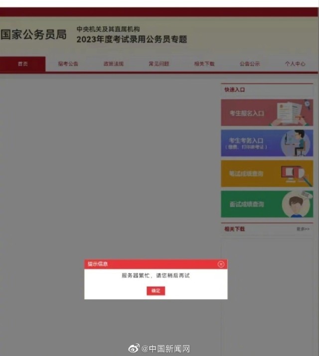 另?yè)?jù)中新網(wǎng)報(bào)道,14日晚間,不少考生在網(wǎng)站曬出剛剛查到的2023國(guó)考筆試成績(jī)。一些網(wǎng)友反映2023國(guó)考專(zhuān)題網(wǎng)頁(yè)上分?jǐn)?shù)查詢通道擁擠,網(wǎng)頁(yè)顯示“服務(wù)器繁忙”。