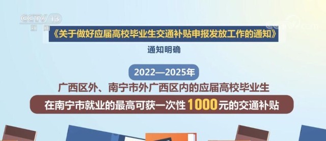 近期,南寧市人社局印發(fā)了《關于做好應屆高校畢業(yè)生交通補貼申報發(fā)放工作的通知》,其中明確,2022—2025年,廣西區(qū)外、南寧市外廣西區(qū)內的應屆高校畢業(yè)生,在南寧市就業(yè)的最高可獲一次性1000元的交通補貼。