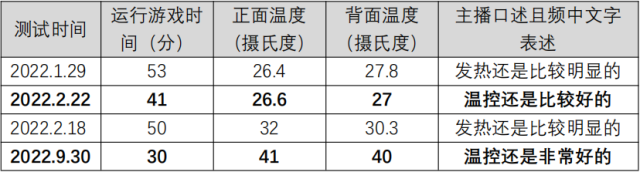 問(wèn)題描述:博主于2022年1月至9月先后4次對(duì)不同手機(jī)進(jìn)行溫度測(cè)試。在經(jīng)過(guò)一定時(shí)間運(yùn)行游戲后,使用測(cè)溫儀對(duì)手機(jī)正面及背面進(jìn)行測(cè)溫,并對(duì)手機(jī)的溫控效果進(jìn)行點(diǎn)評(píng),4次測(cè)評(píng)結(jié)果出入較大,不同品牌的手機(jī)測(cè)評(píng)前后標(biāo)準(zhǔn)不一。