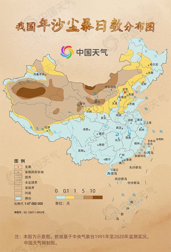 中國(guó)天氣網(wǎng)統(tǒng)計(jì)1991年至2020年來(lái),我國(guó)沙塵暴日數(shù)的分布情況,可以看出沙塵天氣主要影響我國(guó)北方地區(qū),其中,南疆盆地和內(nèi)蒙古西部?jī)傻厥巧硥m暴的高發(fā)區(qū),年沙塵暴日數(shù)在10天以上,部分地區(qū)超過(guò)20天。