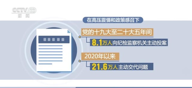 在高壓震懾和政策感召下,黨的十九大至二十大五年間,8.1萬人向紀檢監(jiān)察機關主動投案,2020年以來,21.6萬人主動交代問題。
