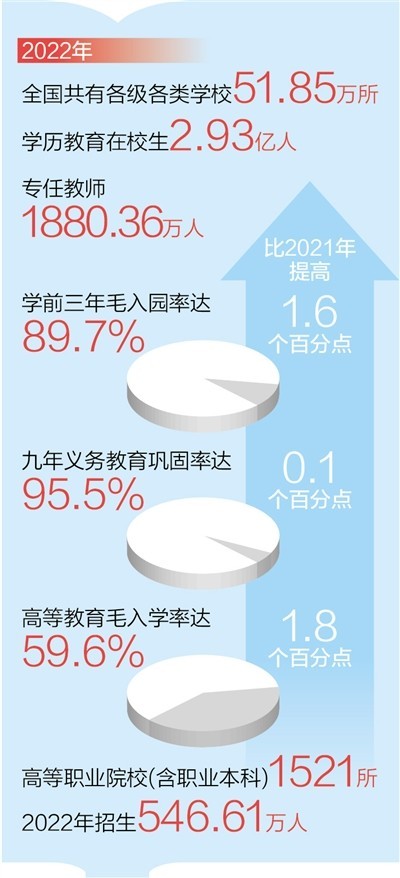 ——普及鞏固水平進(jìn)一步提升。全國(guó)學(xué)前三年毛入園率達(dá)到89.7%,比2021年提高1.6個(gè)百分點(diǎn);九年義務(wù)教育鞏固率達(dá)95.5%,高中階段毛入學(xué)率達(dá)到91.6%。