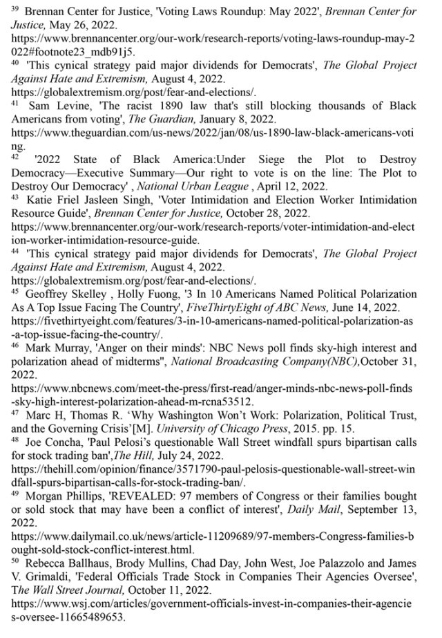 中期選舉成為最昂貴的選舉,美式民主失去民意基礎(chǔ)。美國(guó)的選舉費(fèi)用一再飆升,2022年中期選舉累計(jì)花費(fèi)超過167億美元。億萬富翁的政治獻(xiàn)金占所有聯(lián)邦政治項(xiàng)目獻(xiàn)金的15%,遠(yuǎn)高于2020年選舉周期的11%?!昂诮稹本栀?zèng)暗中操控選舉走向,政治極化和社會(huì)撕裂導(dǎo)致民主共識(shí)難以達(dá)成。69%的美國(guó)人認(rèn)為美國(guó)民主面臨“崩潰風(fēng)險(xiǎn)”,86%的美國(guó)選民表示美國(guó)民主面臨“非常嚴(yán)重的威脅”,人們對(duì)美式民主普遍感到絕望。