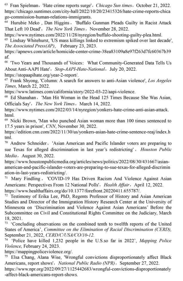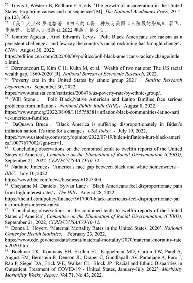 聯(lián)合國(guó)消除種族歧視委員會(huì)2022年9月21日發(fā)布的關(guān)于審議美國(guó)履行《消除一切形式種族歧視國(guó)際公約》情況的結(jié)論性報(bào)告指出,美國(guó)歷史上殖民主義和奴隸制留下的陰影至今仍揮之不去,助長(zhǎng)著美國(guó)社會(huì)流行的種族主義。近幾年來,美國(guó)仇恨犯罪和仇恨言論事件顯著增加,與種族有關(guān)的槍支死傷人數(shù)大幅增加,有色人種和少數(shù)族裔在醫(yī)療、教育、住房等領(lǐng)域持續(xù)面臨系統(tǒng)性歧視。(注57)