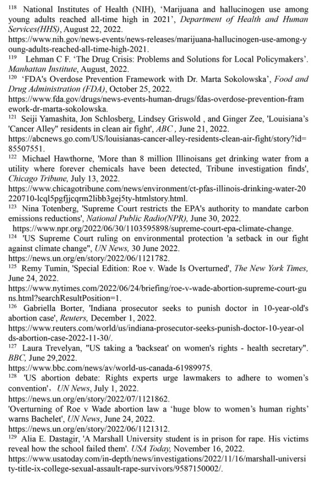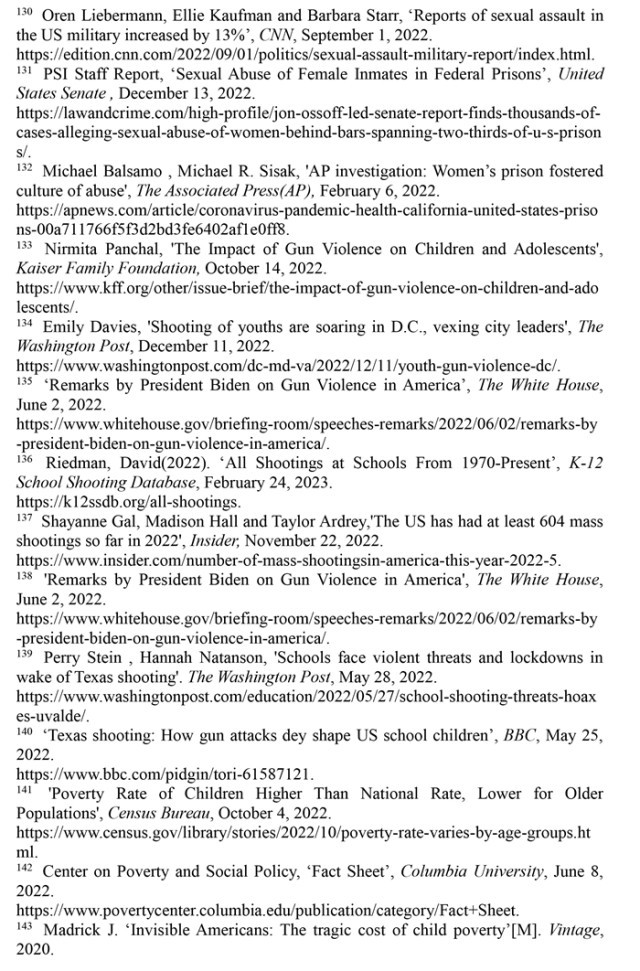 婦女墮胎失去憲法保護(hù),兒童生存環(huán)境令人擔(dān)憂。美國(guó)聯(lián)邦最高法院推翻“羅伊訴韋德案”的裁決終結(jié)了近50年來受憲法保護(hù)的墮胎權(quán),是對(duì)婦女人權(quán)和性別平等的巨大打擊。2022年美國(guó)有超過5800名18歲以下的兒童因槍擊受傷或死亡,校園槍擊事件數(shù)量高達(dá)302起,創(chuàng)1970年以來的最高值。美國(guó)兒童貧困率從2021年12月的12.1%上升至2022年5月的16.6%,增加了330萬貧困兒童。2018年以來被非法雇用的童工激增近70%,2022財(cái)年受雇專門從事危險(xiǎn)工作的兒童增加了26%。