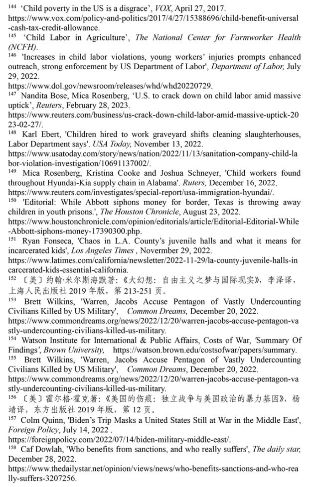 非法使用童工現(xiàn)象屢禁不止。根據(jù)非盈利組織“美國(guó)農(nóng)場(chǎng)工人健康中心”的數(shù)據(jù),美國(guó)有30萬至80萬名未成年人在農(nóng)場(chǎng)工作。(注145)美國(guó)《石板》網(wǎng)絡(luò)雜志指出,美國(guó)很多快餐店違反保護(hù)兒童健康與教育的規(guī)定,雇用青少年超時(shí)工作。童工問題屢禁不止,根源是美國(guó)法律體系存在漏洞。受新冠疫情和供應(yīng)鏈危機(jī)影響,美國(guó)多地出現(xiàn)“用工荒”現(xiàn)象,多州批準(zhǔn)新法案延長(zhǎng)未成年人工作時(shí)間。根據(jù)美國(guó)勞工部的數(shù)據(jù),2022年,美國(guó)有數(shù)百萬青少年受雇在農(nóng)業(yè)、食品服務(wù)、零售、娛樂和建筑行業(yè)工作。(注146)路透社2023年2月28日?qǐng)?bào)道,美國(guó)非法雇傭童工問題日益嚴(yán)重,自2018年以來,被非法雇用的童工激增了近70%。根據(jù)美國(guó)勞工部的數(shù)據(jù),2022財(cái)年有835家企業(yè)違法雇用3800名兒童,受雇專門從事危險(xiǎn)工作的兒童增加了26%。(注147)《今日美國(guó)報(bào)》2022年11月13日?qǐng)?bào)道,威斯康星州帕克斯清潔服務(wù)公司雇用了30多名13至17歲的未成年人在肉類加工廠和農(nóng)場(chǎng)擔(dān)任清潔工。幾名未成年雇員在工作中受傷,其中一名13歲兒童被腐蝕性清潔化學(xué)品燒傷。(注148)路透社2022年12月16日?qǐng)?bào)道,在阿拉巴馬州至少有四家汽車零部件供應(yīng)商被發(fā)現(xiàn)雇傭童工,勞務(wù)派遣機(jī)構(gòu)將未成年人移民安置在工廠工作。(注149)時(shí)至今日,美國(guó)仍是聯(lián)合國(guó)193個(gè)會(huì)員國(guó)中唯一沒有批準(zhǔn)《兒童權(quán)利公約》的國(guó)家,解決雇傭童工問題的前景依然黯淡。