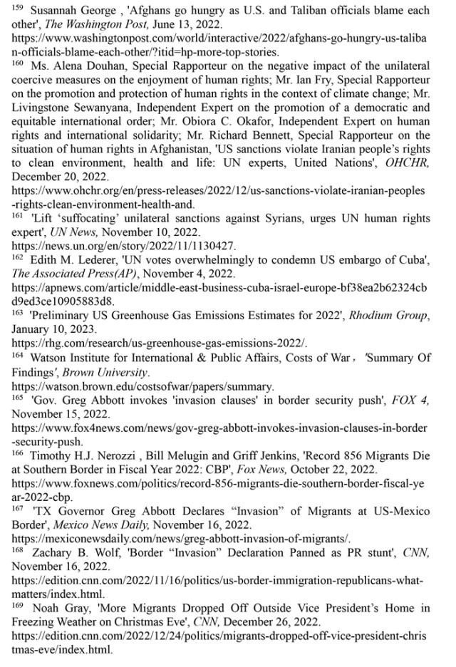 長(zhǎng)期肆意實(shí)施單邊制裁。近年來,美國(guó)對(duì)其他國(guó)家實(shí)施的單邊制裁呈指數(shù)級(jí)增長(zhǎng),極大削弱了被制裁國(guó)家人權(quán)保障的能力與水平。孟加拉國(guó)《每日星報(bào)》2022年12月28日?qǐng)?bào)道,美國(guó)實(shí)施的單邊制裁總數(shù)為世界之最,目前仍在對(duì)20多個(gè)國(guó)家實(shí)施制裁,包括1962年以來對(duì)古巴的制裁、1979年以來對(duì)伊朗的制裁、2011年以來對(duì)敘利亞的制裁,以及近年來對(duì)阿富汗的制裁,導(dǎo)致被制裁國(guó)家無法向其人民提供基本的食物和藥品。(注158)《華盛頓郵報(bào)》2022年6月13日?qǐng)?bào)道,近一半的阿富汗人沒有足夠的食物,兒童營(yíng)養(yǎng)不良呈上升趨勢(shì)。(注159)2022年12月20日,多名聯(lián)合國(guó)人權(quán)理事會(huì)獨(dú)立專家發(fā)表共同聲明指出,美國(guó)政府對(duì)伊朗的制裁加劇了伊朗的環(huán)境危害,使所有在伊朗的民眾無法充分享受健康權(quán)和生命權(quán),侵犯了伊朗人民享有清潔環(huán)境的權(quán)利。(注160)聯(lián)合國(guó)單邊強(qiáng)制措施對(duì)人權(quán)負(fù)面影響問題特別報(bào)告員阿萊娜·杜晗2022年11月10日指出,單邊制裁加劇了敘利亞人民的苦難,是對(duì)人權(quán)的嚴(yán)重侵犯。(注161)美國(guó)政府肆意實(shí)施制裁引發(fā)他國(guó)人權(quán)危機(jī)受到國(guó)際社會(huì)強(qiáng)烈譴責(zé)。2022年11月3日,聯(lián)合國(guó)大會(huì)就敦促美國(guó)終止對(duì)古巴的經(jīng)濟(jì)、商業(yè)和金融封鎖進(jìn)行投票表決。在193個(gè)成員國(guó)中,多達(dá)185個(gè)國(guó)家支持譴責(zé)美國(guó)對(duì)古巴的禁運(yùn)。(注162)這是聯(lián)合國(guó)大會(huì)連續(xù)30次通過類似決議。