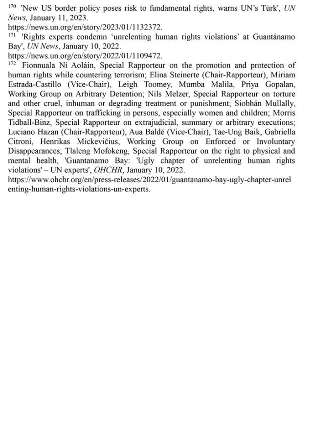 拒不關(guān)閉關(guān)塔那摩監(jiān)獄。2002年設(shè)立的關(guān)塔那摩監(jiān)獄最多時(shí)曾關(guān)押約780人,其中大多數(shù)人未經(jīng)審判便遭拘留,受到了殘忍的、不人道的待遇,是美國(guó)“肆意侵犯人權(quán)的一個(gè)丑陋篇章”。(注171)聯(lián)合國(guó)人權(quán)理事會(huì)在反恐中促進(jìn)和保障人權(quán)問題特別報(bào)告員菲奧努阿拉·尼奧萊因等多名獨(dú)立專家2022年1月發(fā)表共同聲明指出,臭名昭著的關(guān)塔那摩監(jiān)獄是美國(guó)在人權(quán)保護(hù)上的污點(diǎn),要求美國(guó)政府關(guān)閉關(guān)塔那摩監(jiān)獄,對(duì)遭受酷刑、任意拘留的公民進(jìn)行賠償,并根據(jù)國(guó)際法追究授權(quán)和實(shí)施酷刑的人員的責(zé)任。(注172)