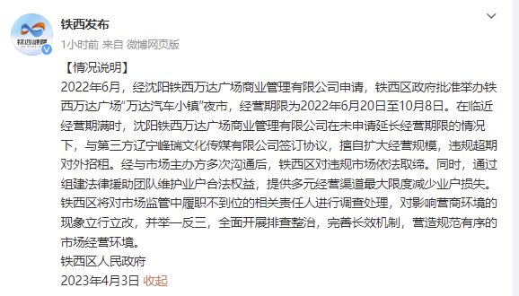 央視網(wǎng)消息:據(jù)@鐵西發(fā)布 微博4月3日消息,鐵西區(qū)人民政府發(fā)布情況說明。2022年6月,經(jīng)沈陽鐵西萬達(dá)廣場商業(yè)管理有限公司申請,鐵西區(qū)政府批準(zhǔn)舉辦鐵西萬達(dá)廣場“萬達(dá)汽車小鎮(zhèn)”夜市,經(jīng)營期限為2022年6月20日至10月8日。在臨近經(jīng)營期滿時(shí),沈陽鐵西萬達(dá)廣場商業(yè)管理有限公司在未申請延長經(jīng)營期限的情況下,與第三方遼寧峰瑞文化傳媒有限公司簽訂協(xié)議,擅自擴(kuò)大經(jīng)營規(guī)模,違規(guī)超期對(duì)外招租。經(jīng)與市場主辦方多次溝通后,鐵西區(qū)對(duì)違規(guī)市場依法取締。同時(shí),通過組建法律援助團(tuán)隊(duì)維護(hù)業(yè)戶合法權(quán)益,提供多元經(jīng)營渠道最大限度減少業(yè)戶損失。