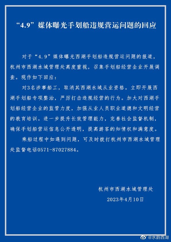 央視網(wǎng)消息:據(jù)@水韻西湖微博消息,對(duì)于“4·9”媒體曝光西湖手劃船違規(guī)營(yíng)運(yùn)問(wèn)題的報(bào)道,杭州西湖水域管理處高度重視,召集手劃船經(jīng)營(yíng)企業(yè)開(kāi)展調(diào)查?,F(xiàn)作如下回應(yīng):