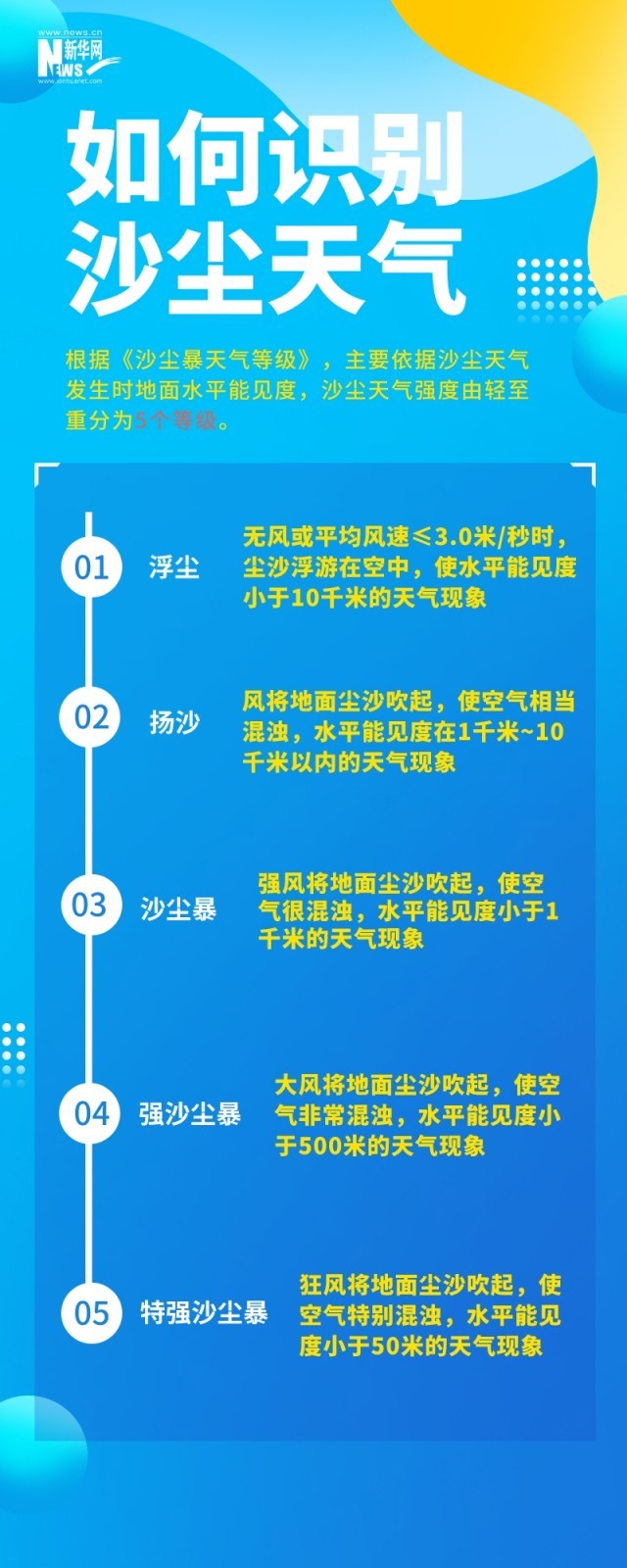 沙塵天氣是指風將地面塵土、沙粒卷入空中,使空氣混濁的天氣現(xiàn)象。根據(jù)《沙塵暴天氣等級》,主要依據(jù)沙塵天氣發(fā)生時地面水平能見度,沙塵天氣強度由輕至重分為5個等級。