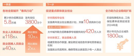 保重點,促進重點群體就業(yè)創(chuàng)業(yè)。針對高校畢業(yè)生,將實施促進高校畢業(yè)生等青年就業(yè)創(chuàng)業(yè)推進計劃,開展10項具體行動,著力拓展就業(yè)渠道、做實做細(xì)就業(yè)服務(wù)、強化困難兜底保障。截至4月中旬,大中城市聯(lián)合招聘春季專場提供崗位420萬人次。針對農(nóng)民工、就業(yè)困難人員,將組建勞務(wù)協(xié)作聯(lián)盟,健全跨區(qū)域信息共享和勞務(wù)輸出機制。加強困難群體就業(yè)兜底幫扶,確保零就業(yè)家庭至少有一人就業(yè)。