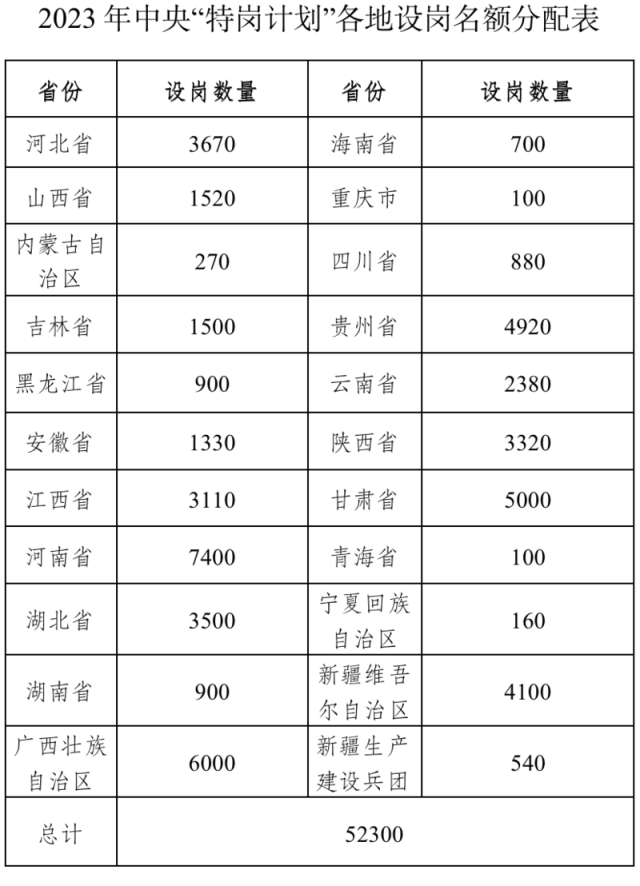 今年全國計劃招聘特崗教師52300名