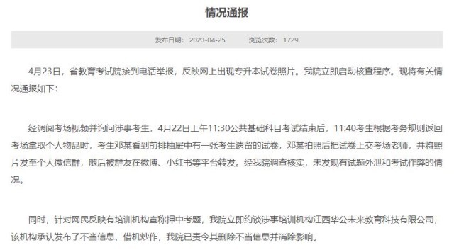 經(jīng)調(diào)閱考場視頻并詢問涉事考生,4月22日上午11:30公共基礎(chǔ)科目考試結(jié)束后,11:40考生根據(jù)考務(wù)規(guī)則返回考場拿取個人物品時,考生鄧某看到前排抽屜中有一張考生遺留的試卷,鄧某拍照后把試卷上交考場老師,并將照片發(fā)至個人微信群,隨后被群友在微博、小紅書等平臺轉(zhuǎn)發(fā)。經(jīng)江西省教育考試院調(diào)查核實,未發(fā)現(xiàn)有試題外泄和考試作弊的情況。