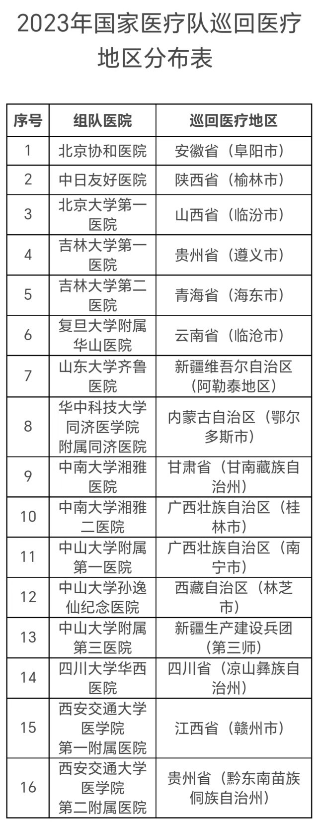 國(guó)家醫(yī)療隊(duì)的組隊(duì)醫(yī)院包括北京協(xié)和醫(yī)院、中日友好醫(yī)院等16家,分赴安徽、陜西等地,派出時(shí)間為6—10月。每支國(guó)家醫(yī)療隊(duì)不少于5人,以副高及以上職稱的醫(yī)務(wù)人員為主,重點(diǎn)開展巡回醫(yī)療、技術(shù)和管理指導(dǎo)、人員培訓(xùn)、加強(qiáng)遠(yuǎn)程醫(yī)療協(xié)作網(wǎng)建設(shè)等工作。工作時(shí)間不少于3周,其中在縣域開展工作的時(shí)間不少于兩周。