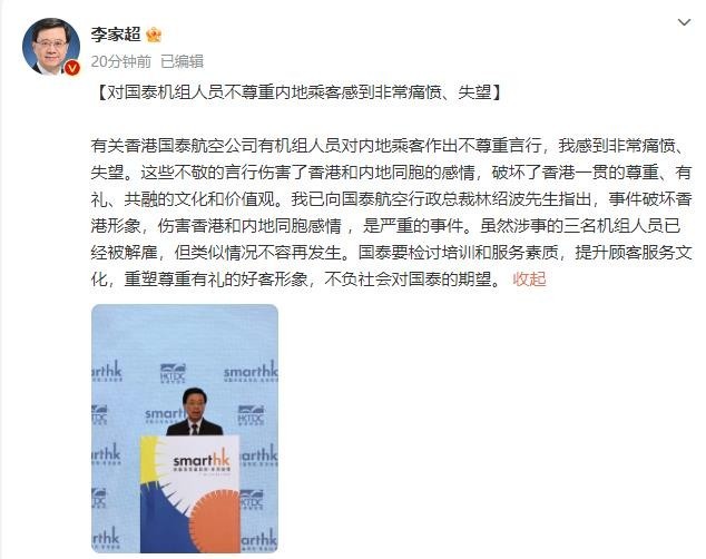 李家超表示,他已向國泰航空行政總裁林紹波提出,此次事件屬于嚴重事件,國泰航空需進行檢討,類似情況不容再次發(fā)生。