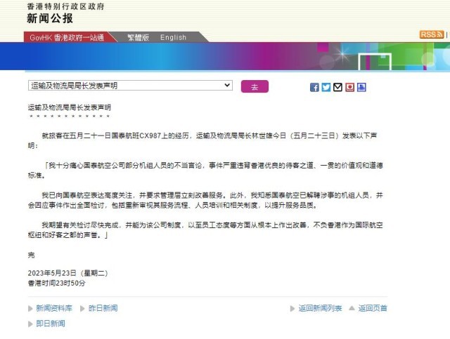 香港運輸及物流局局長林世雄23日晚間發(fā)布聲明表示,十分痛心國泰航空公司部分機組人員的不當(dāng)言論,事件嚴重違背香港優(yōu)良的待客之道、一貫的價值觀和道德標(biāo)準(zhǔn)。