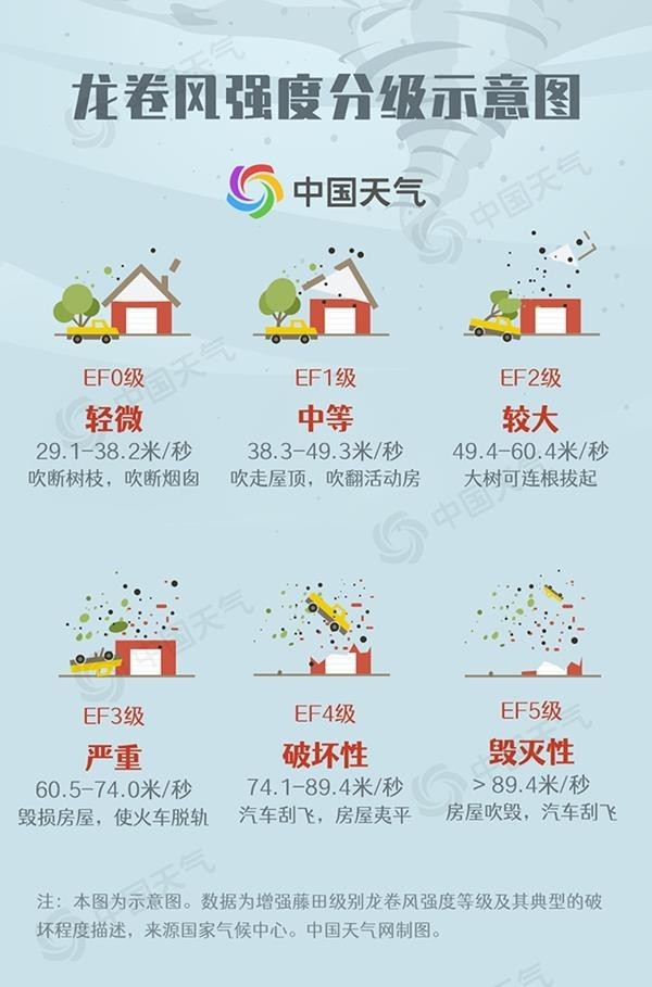 龍卷風(fēng)生成和消失都迅速,常與雷暴、冰雹和暴雨等強對流天氣系統(tǒng)相伴出現(xiàn),破壞力極強。按藤田級數(shù),龍卷強度分為EF0級至EF5級6個等級,EF0級別最低,EF5為最高級別。