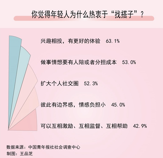 近日,中國(guó)青年報(bào)社社會(huì)調(diào)查中心聯(lián)合問(wèn)卷網(wǎng)(wenjuan.com),對(duì)1335名受訪者進(jìn)行的一項(xiàng)調(diào)查顯示,63.1%的受訪青年認(rèn)為找“搭子”是因?yàn)榕d趣相投,有更好的體驗(yàn),53.0%的青年覺(jué)得是因?yàn)樽鍪虑橄胍腥伺慊蛘叻謸?dān)成本。