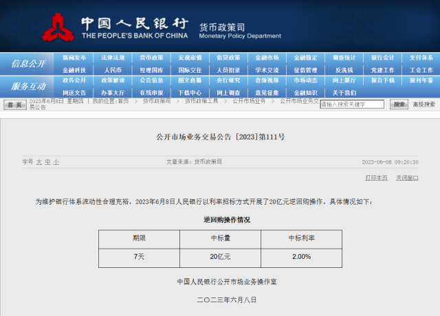 據央行官網消息,為維護銀行體系流動性合理充裕,2023年6月8日中國人民銀行以利率招標方式開展了20億元逆回購操作。具體情況如下:
