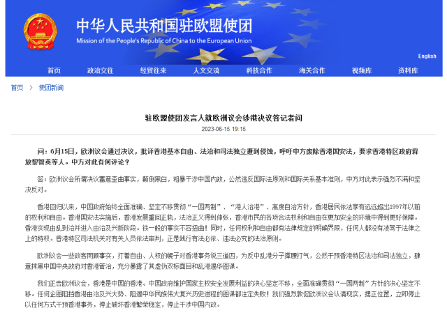 央視網(wǎng)消息:據(jù)中國駐歐盟使團(tuán)網(wǎng)站消息,駐歐盟使團(tuán)發(fā)言人就歐洲議會涉港決議答記者問。