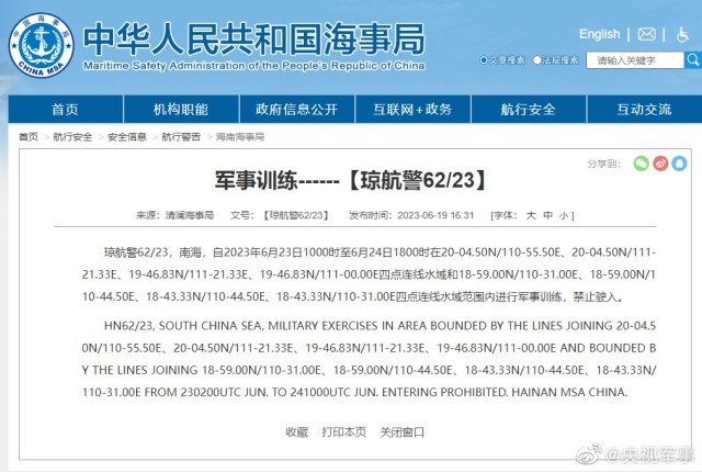 央視網(wǎng)消息:據(jù)中國海事局網(wǎng)站消息,清瀾海事局發(fā)布航行警告,6月23日10時至6月24日18時,南海部分海域進行軍事訓練,禁止駛?cè)搿?/p>