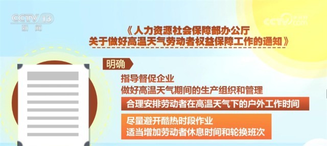 《通知》明確,指導(dǎo)督促企業(yè)做好高溫天氣期間的生產(chǎn)組織和管理,合理安排勞動(dòng)者在高溫天氣下的戶外工作時(shí)間,盡量避開(kāi)酷熱時(shí)段作業(yè),適當(dāng)增加勞動(dòng)者休息時(shí)間和輪換班次。