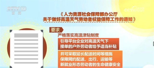 央視網(wǎng)消息:近日,人力資源和社會(huì)保障部就做好高溫天氣勞動(dòng)者權(quán)益保障工作印發(fā)《通知》。其中,對(duì)快遞、外賣人員等靈活就業(yè)人員的高溫天氣下如何保障做出了專門的要求。