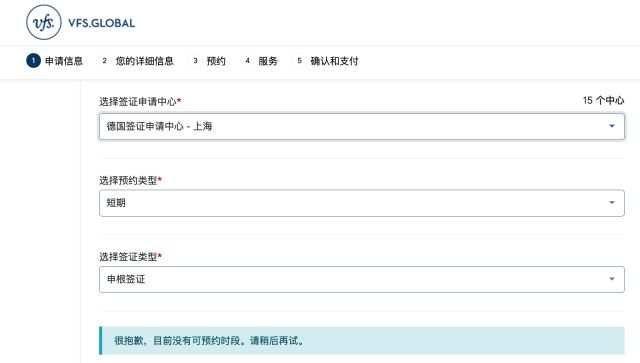 如在威孚仕官網,在國內多個城市的德國簽證申請中心申請短期申根簽證都顯示“目前沒有可預約時段”。