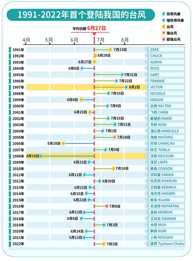 1991-2022年首個登陸我國的臺風(fēng)名稱、登陸日期及登陸時強度 丁茜制圖