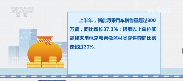 隨著居民消費理念轉變,促進消費提質升級政策顯效,消費新動能持續(xù)增強。上半年,新能源乘用車銷售量超過300萬輛,同比增長37.3%;限額以上單位低能耗家用電器和音像器材類零售額同比增速超過20%。