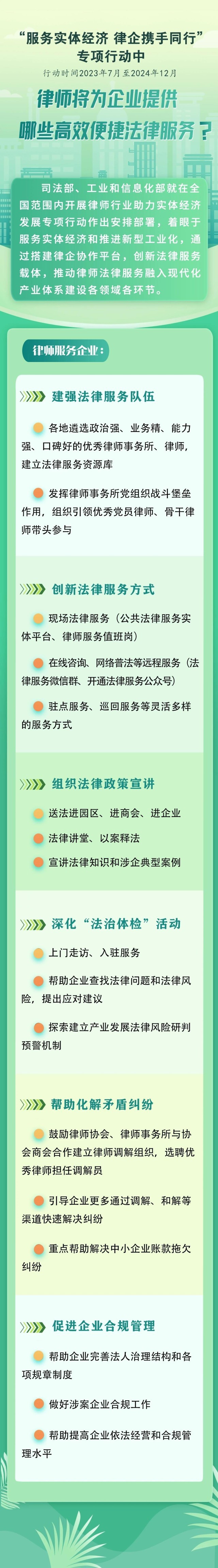 《方案》要求,各地司法行政部門、工業(yè)和信息化主管部門、通信管理局和律師協會要共同組織優(yōu)秀律師事務所和律師,為工業(yè)和信息化領域相關企業(yè)提供全業(yè)務、全時空、高效便捷的法律服務?;顒又校甯黝惼髽I(yè)法律服務需求,建強法律服務隊伍,創(chuàng)新法律服務方式,通過開展法律政策宣講、深化“法治體檢”活動等形式,推動律師行業(yè)服務實體經濟的廣度和深度不斷拓展,服務的專業(yè)性、精準性、便捷性、實效性不斷增強,幫助企業(yè)化解法律風險,解決法律問題,維護合法權益,提升依法合規(guī)經營管理水平。