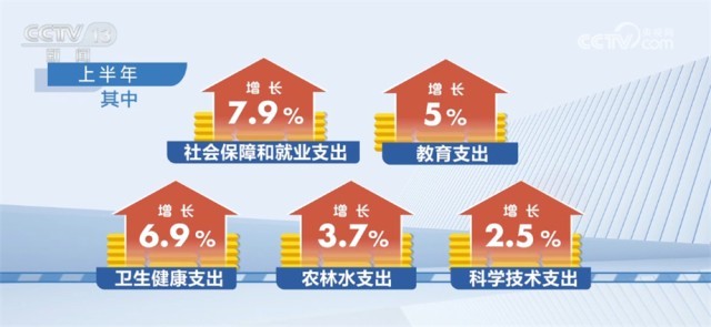 從支出看,上半年,全國(guó)一般公共預(yù)算支出133893億元,同比增長(zhǎng)3.9%。其中,社會(huì)保障和就業(yè)支出增長(zhǎng)7.9%,教育支出增長(zhǎng)5%,衛(wèi)生健康支出增長(zhǎng)6.9%,農(nóng)林水支出增長(zhǎng)3.7%,科學(xué)技術(shù)支出增長(zhǎng)2.5%,基本民生、鄉(xiāng)村振興、區(qū)域重大戰(zhàn)略、教育、科技攻關(guān)等重點(diǎn)支出得到有力保障。