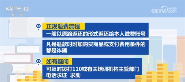 正規(guī)退費(fèi)流程一般以原路返還的形式返還給本人繳費(fèi)賬號(hào),凡是退款時(shí)附加購(gòu)買(mǎi)商品或支付費(fèi)用條件的都是詐騙。如有疑問(wèn),可及時(shí)撥打110或有關(guān)培訓(xùn)機(jī)構(gòu)主管部門(mén)電話(huà)求證、求助。
