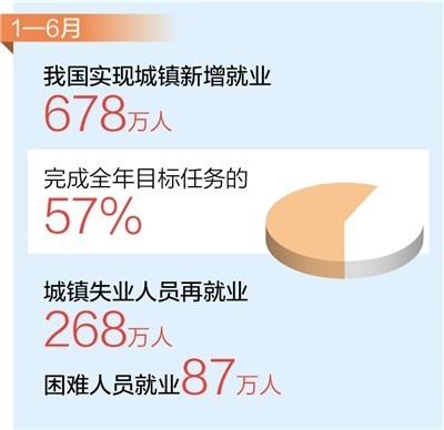 前6月,我國實(shí)現(xiàn)城鎮(zhèn)新增就業(yè)678萬人,完成全年目標(biāo)任務(wù)的57% 就業(yè)形勢保持總體穩(wěn)定