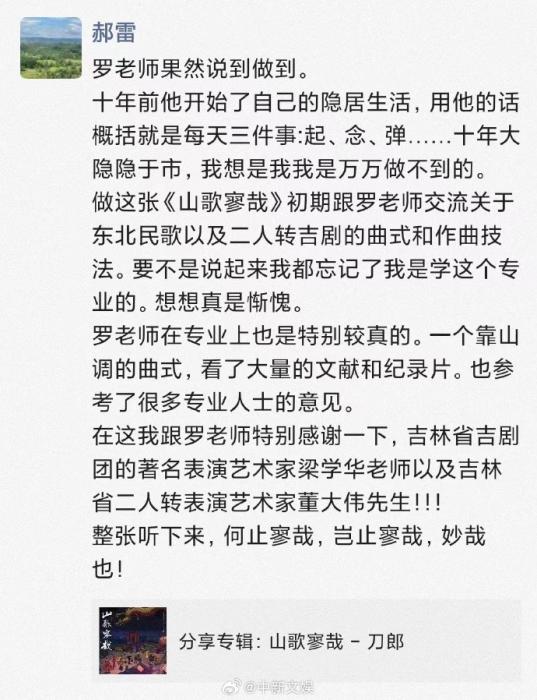 在《山歌寥哉》專輯介紹最后,刀郎專門感謝了郝雷、梁學(xué)華、董大偉老師對(duì)該專輯提供的幫助。