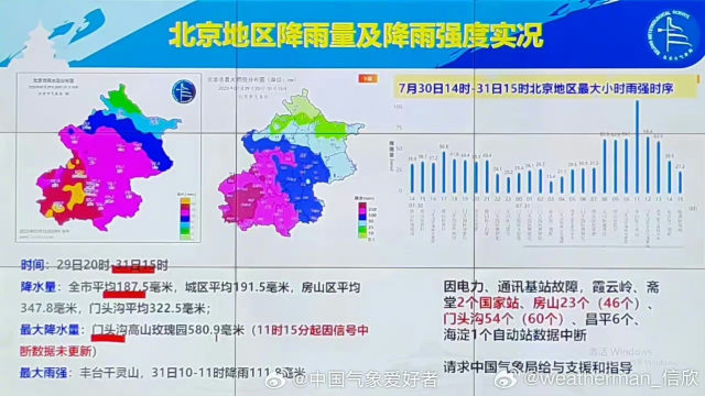 微博賬號(hào)“中國氣象愛好者”發(fā)布消息稱,北京西部大量氣象站因特大暴雨導(dǎo)致電力通信和設(shè)備故障失聯(lián) 來源:微博