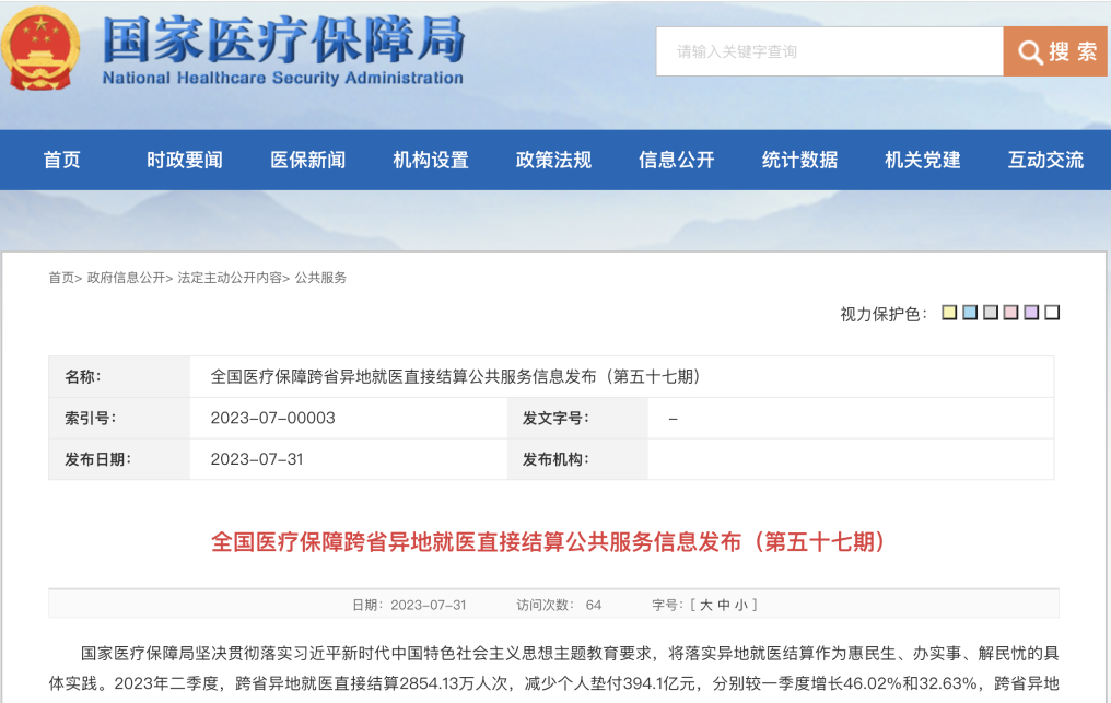 此外,住院費(fèi)用跨省直接結(jié)算規(guī)模進(jìn)一步增長。截至2023年二季度末,全國住院費(fèi)用跨省聯(lián)網(wǎng)定點(diǎn)醫(yī)療機(jī)構(gòu)達(dá)7.44萬家,較一季度末增長0.69萬家。2023年二季度,住院費(fèi)用跨省直接結(jié)算282.57萬人次。