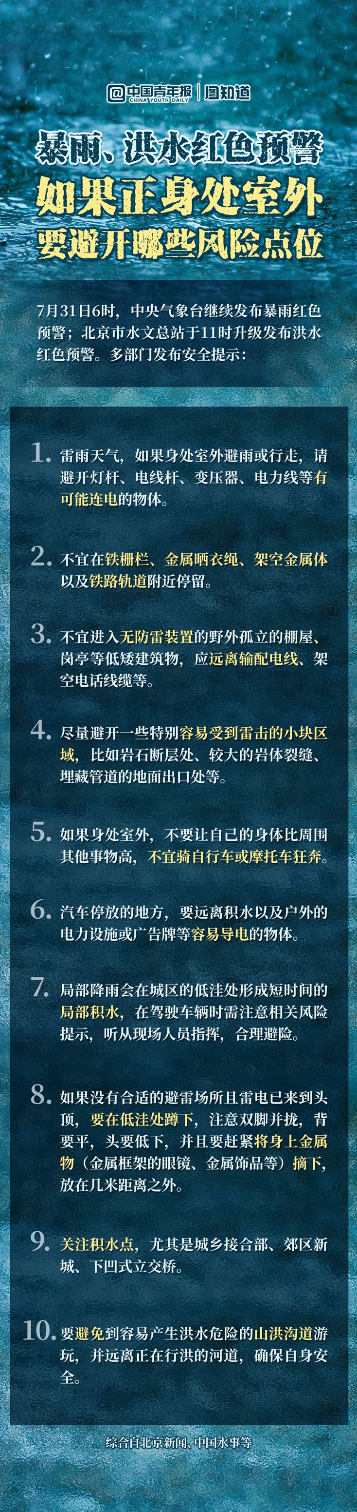 7月31日6時(shí),中央氣象臺(tái)繼續(xù)發(fā)布暴雨紅色預(yù)警。北京市水文總站于當(dāng)日11時(shí)升級(jí)發(fā)布洪水紅色預(yù)警。如果遇到暴雨、洪水時(shí)恰好身處室外,應(yīng)避開哪些風(fēng)險(xiǎn)點(diǎn)位?學(xué)習(xí)科普知識(shí),安全度汛。