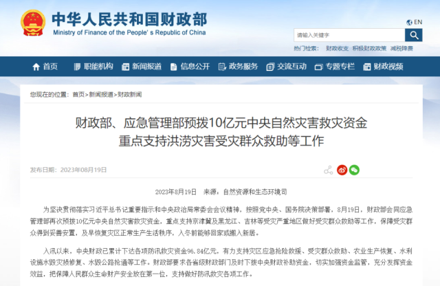 為堅(jiān)決貫徹落實(shí)習(xí)近平總書記重要指示和中央政治局常委會(huì)會(huì)議精神,按照黨中央、國(guó)務(wù)院決策部署,8月19日,財(cái)政部會(huì)同應(yīng)急管理部再次預(yù)撥10億元中央自然災(zāi)害救災(zāi)資金,重點(diǎn)支持京津冀及黑龍江、吉林等受災(zāi)嚴(yán)重地區(qū)做好受災(zāi)群眾救助等工作,保障受災(zāi)群眾得到妥善安置,及早恢復(fù)災(zāi)區(qū)正常生產(chǎn)生活秩序,入冬前能夠回家或搬入新居。
