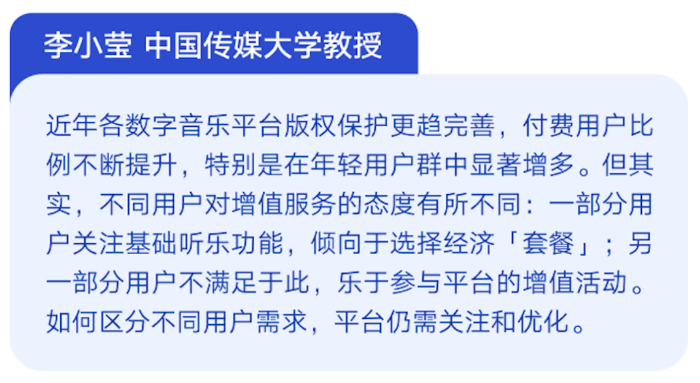“近年各數(shù)字音樂平臺(tái)版權(quán)保護(hù)更趨完善,付費(fèi)用戶比例不斷提升,特別是在年輕用戶群中顯著增多”,中國傳媒大學(xué)教授李小瑩指出,不同用戶對(duì)增值服務(wù)的態(tài)度有所不同:一部分用戶關(guān)注基礎(chǔ)聽樂功能,傾向于選擇經(jīng)濟(jì)“套餐”;另一部分用戶不滿足于此,樂于參與平臺(tái)的增值活動(dòng)。