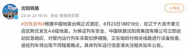 央視網(wǎng)消息:據(jù)@沈陽(yáng)鐵路 微博消息,根據(jù)中國(guó)地震臺(tái)網(wǎng)正式測(cè)定,8月23日18時(shí)19分,在遼寧大連市普蘭店區(qū)附近發(fā)生4.6級(jí)地震。為保證列車(chē)安全,中國(guó)鐵路沈陽(yáng)局集團(tuán)有限公司立即啟動(dòng)應(yīng)急響應(yīng),對(duì)管內(nèi)運(yùn)行列車(chē)采取扣停措施,正在組織對(duì)相關(guān)線路進(jìn)行設(shè)備檢查,途經(jīng)列車(chē)將出現(xiàn)不同程度晚點(diǎn)。具體列車(chē)運(yùn)行信息請(qǐng)關(guān)注相關(guān)站車(chē)公告。