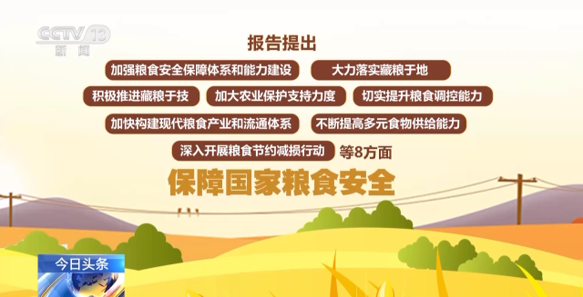 報告提出,將從加強糧食安全保障體系和能力建設、大力落實藏糧于地、積極推進藏糧于技、加大農(nóng)業(yè)保護支持力度、切實提升糧食調(diào)控能力、加快構(gòu)建現(xiàn)代糧食產(chǎn)業(yè)和流通體系、不斷提高多元食物供給能力、深入開展糧食節(jié)約減損行動等8方面,保障國家糧食安全。