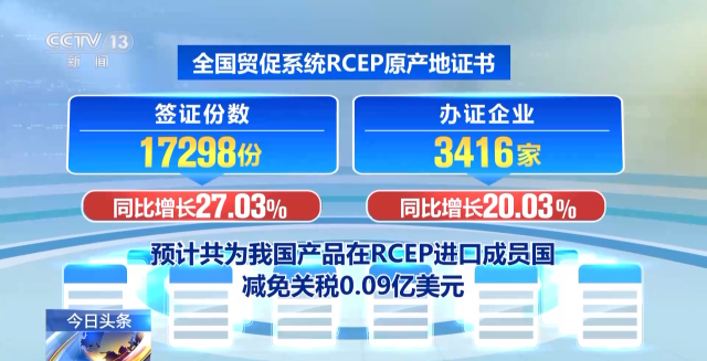中國貿(mào)促會8月30日介紹:今年7月份,全國貿(mào)促系統(tǒng)累計簽發(fā)原產(chǎn)地證書等各類證書54.62萬份,較上年同比增長12.82%。全國貿(mào)促系統(tǒng)RCEP原產(chǎn)地證書簽證份數(shù)為17298份,同比增長27.03%;辦證企業(yè)3416家,同比增長20.03%,預計共為我國產(chǎn)品在RCEP進口成員國減免關(guān)稅0.09億美元。