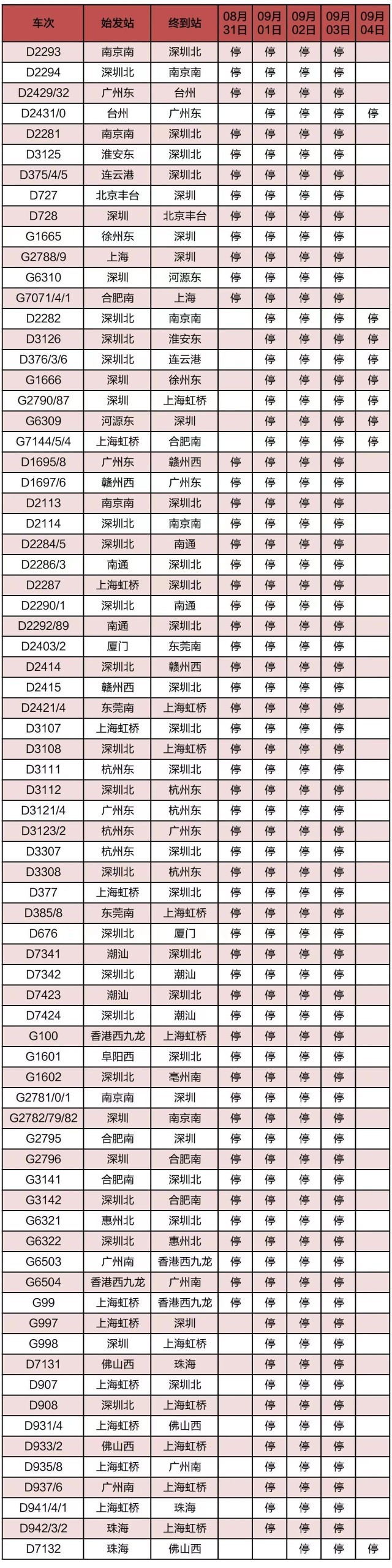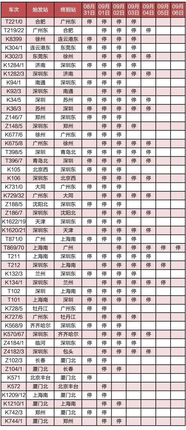 “長三角鐵路”消息:受第9號(hào)臺(tái)風(fēng)“蘇拉”影響,為確保列車運(yùn)行安全,鐵路部門計(jì)劃對(duì)杭深線、京港高鐵、廣深城際、廣深港高鐵、穗深城際、京九線等線路運(yùn)行的部分列車采取停運(yùn)措施,計(jì)劃停運(yùn)8月31日至9月6日間共121趟旅客列車:其中停運(yùn)動(dòng)車組列車74趟,停運(yùn)普速列車47趟。(停運(yùn)列車車次信息見附表)