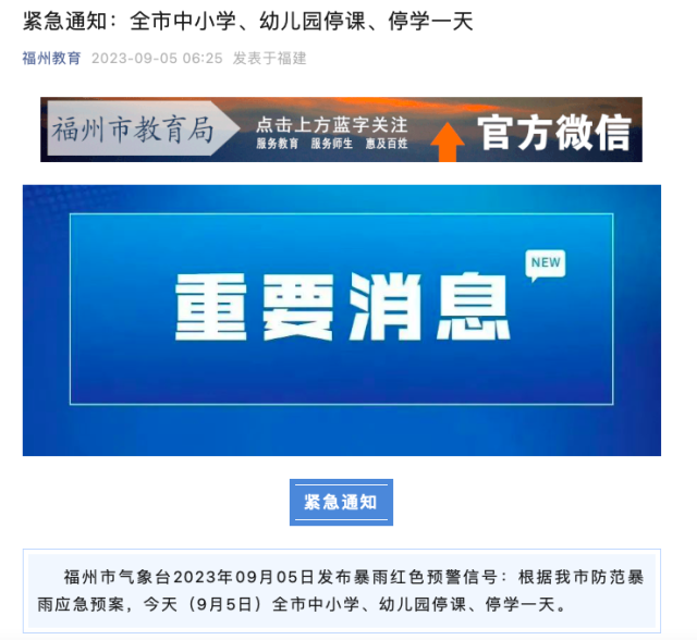中國青年報(bào)客戶端福州9月5日電(中青報(bào)·中青網(wǎng)記者 田宏煒)今天早上6時(shí),福州市教育局緊急通知,根據(jù)福州市防范暴雨應(yīng)急預(yù)案,全市中小學(xué)、幼兒園停課、停學(xué)一天。