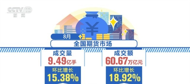 中國期貨業(yè)協(xié)會(huì)數(shù)據(jù)顯示,8月全國期貨市場成交量為9.49億手,成交額為60.67萬億元,同比分別增長47.76%和23.49%,環(huán)比分別增長15.38%和18.92%。